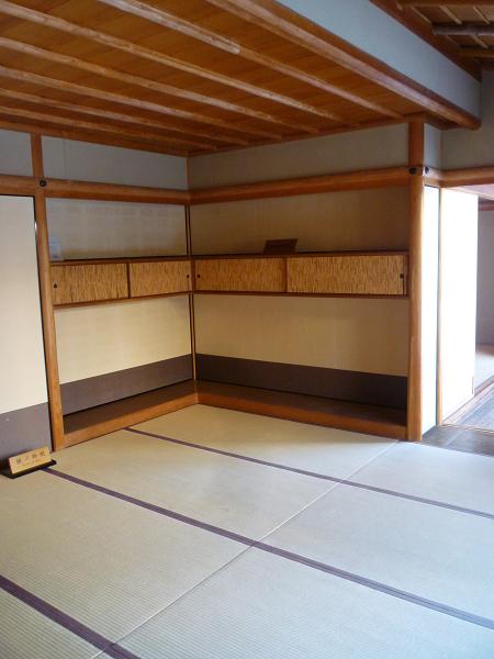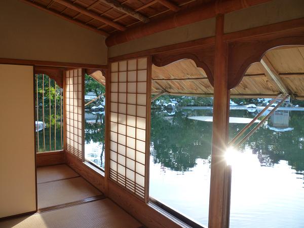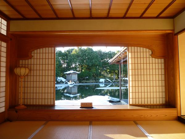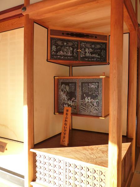 螺鈿作りの脇棚、御月見の間からの池、鎖の間。