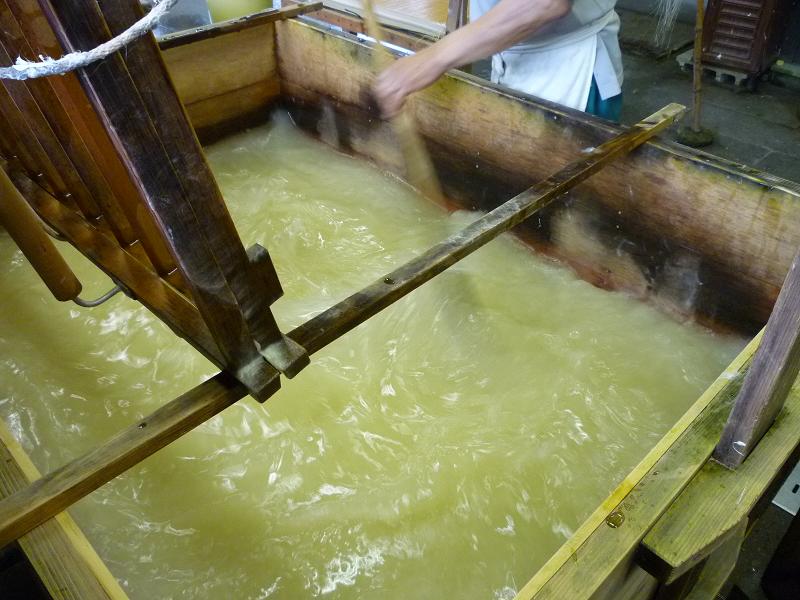 原料のコウゾと、とろろあおいを入れてかき混ぜてる。