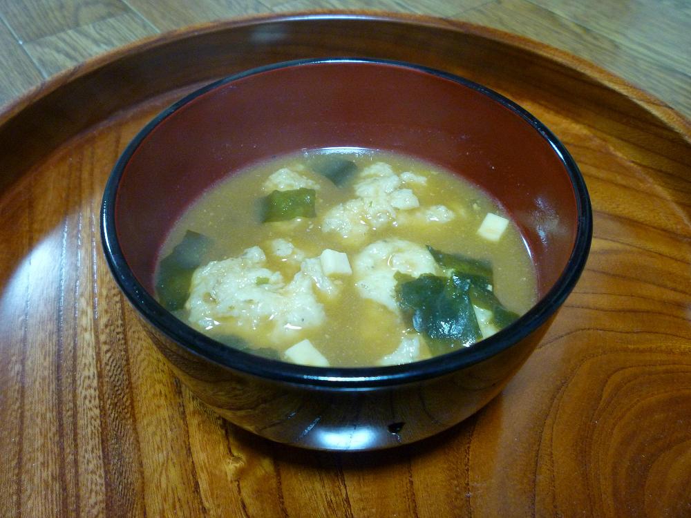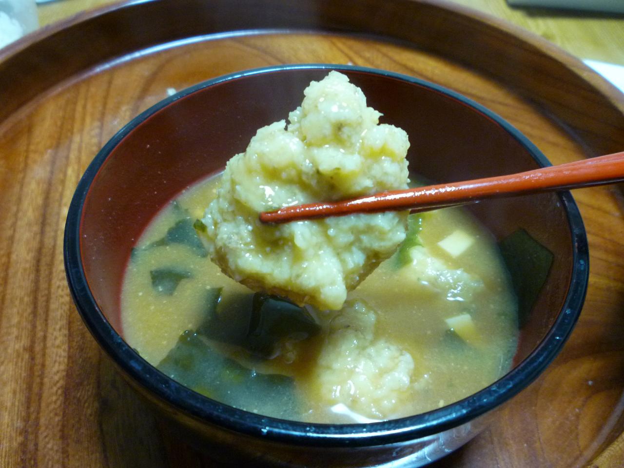 お味噌汁に、おろした自然薯を入れたもの。粘度があるので、団子状になる。