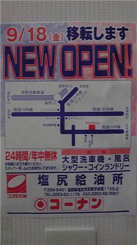 埼玉のコーナン(ガソリンスタンド)で見つけた、塩尻(長野県)のコーナンの移転の広告です。